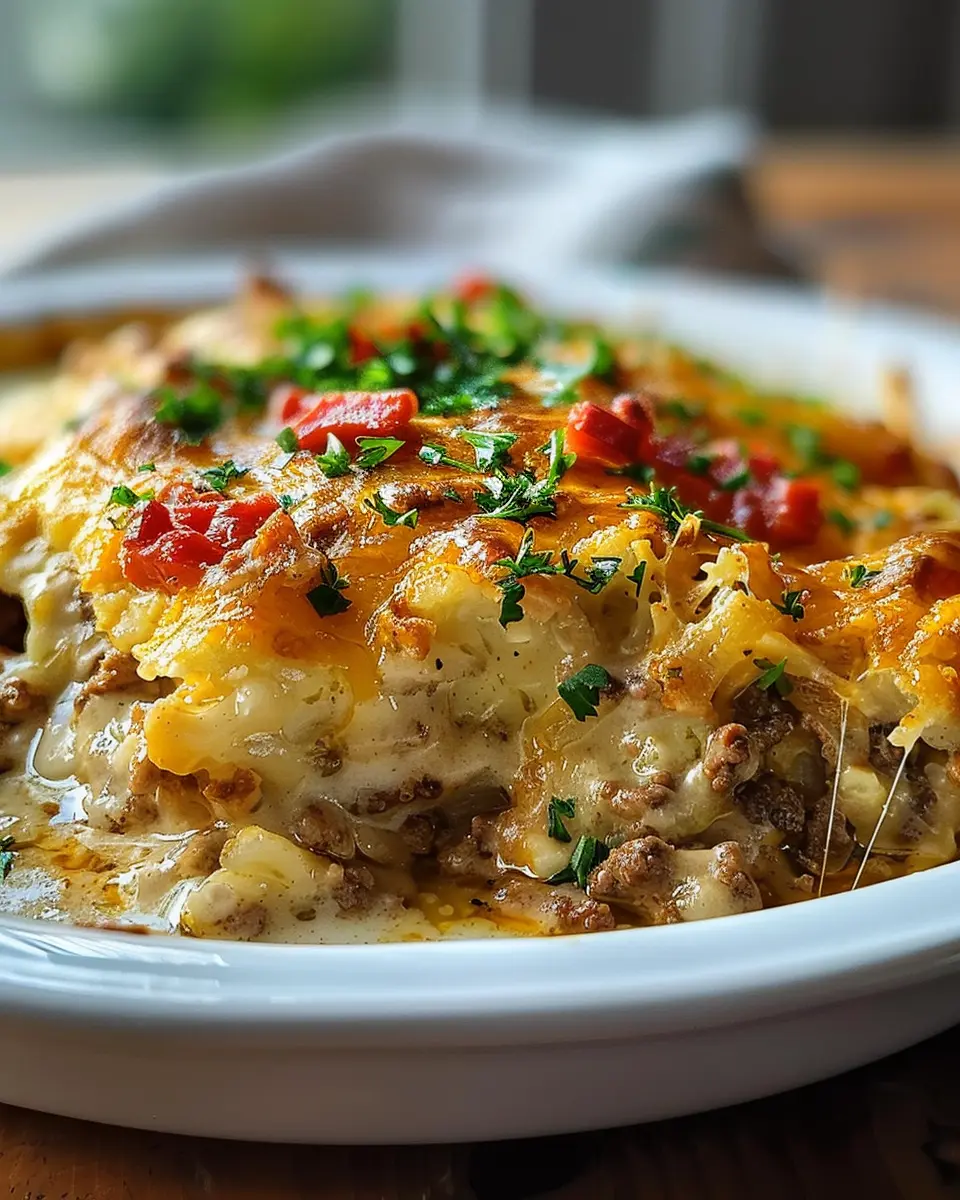 Now that you have your creamy base ready, it’s time to layer the ingredients in a baking dish. Start by pouring in the beef and creamy mixture, ensuring an even spread. Next, sprinkle half of your shredded cheese on top. Then, distribute the crumbled turkey bacon for that extra savory crunch. Finally, layer the remaining cheese over everything to create a gooey top.