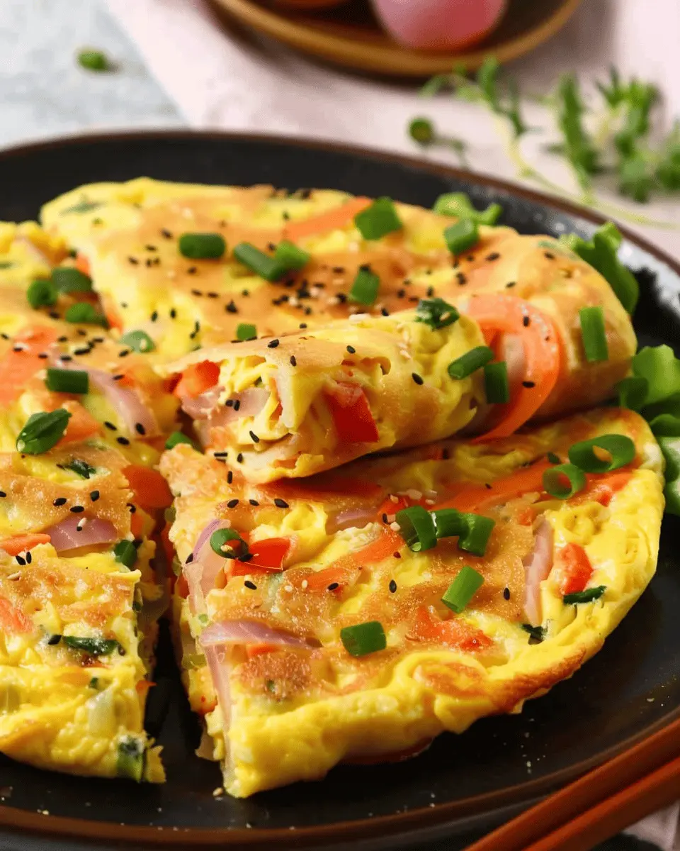 Think beyond the plate! The Korean rolled omelette can be served cold as a quick snack or added to rice paper wraps for a fresh, on-the-go option. Try slicing it into bite-sized pieces to create a colorful appetizer platter at your next gathering. For a personal touch, consider garnishing with chopped green onions or toasted sesame seeds.